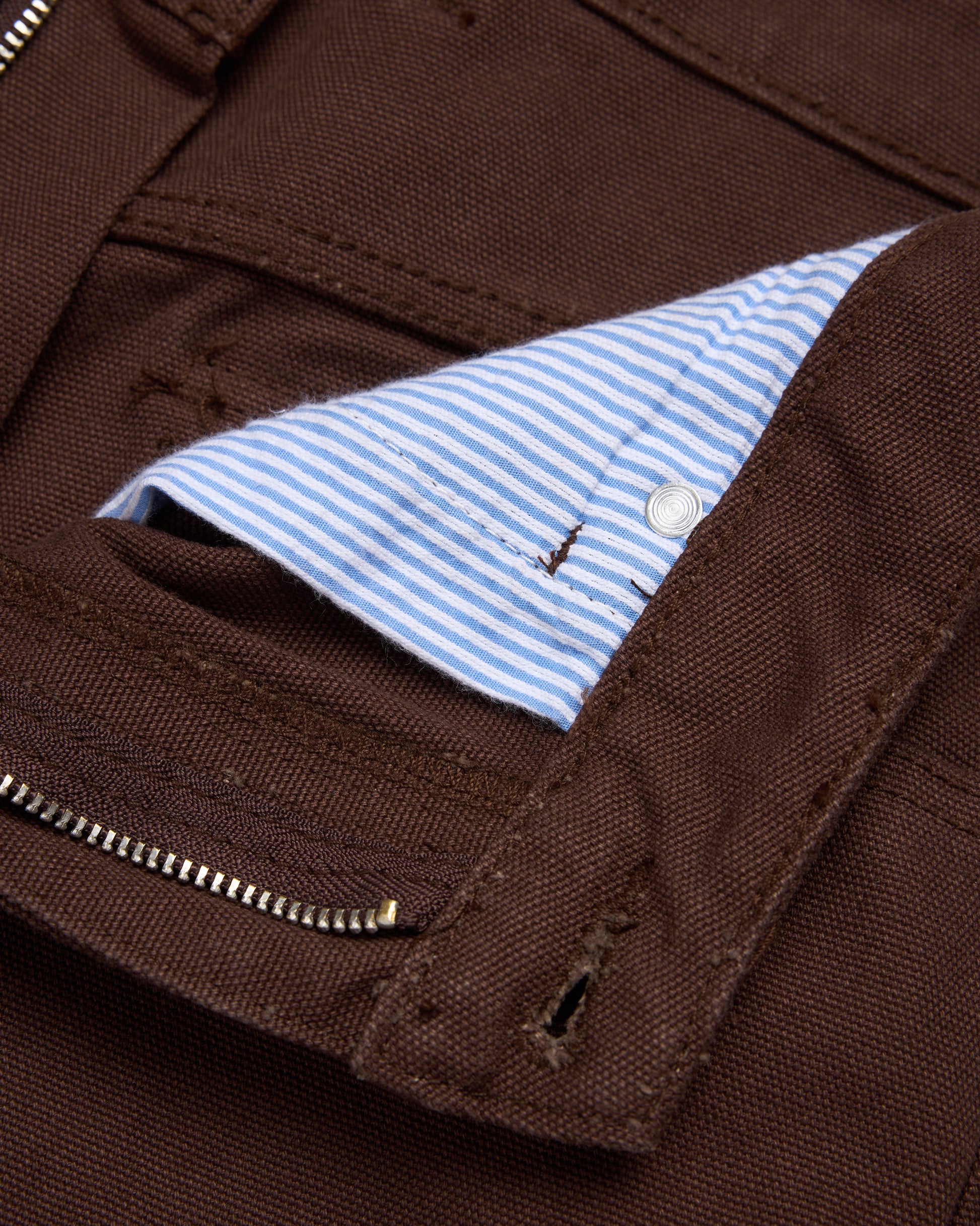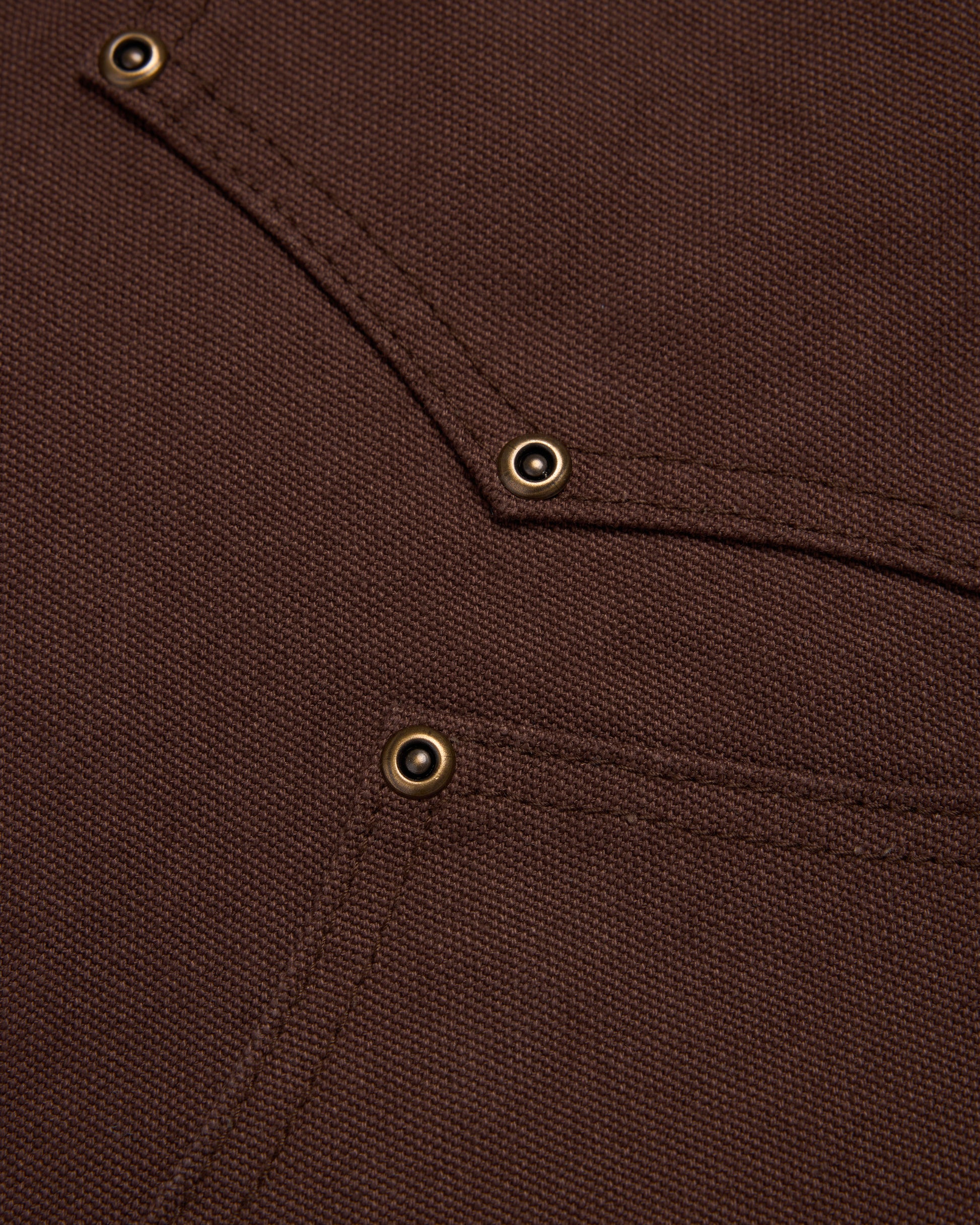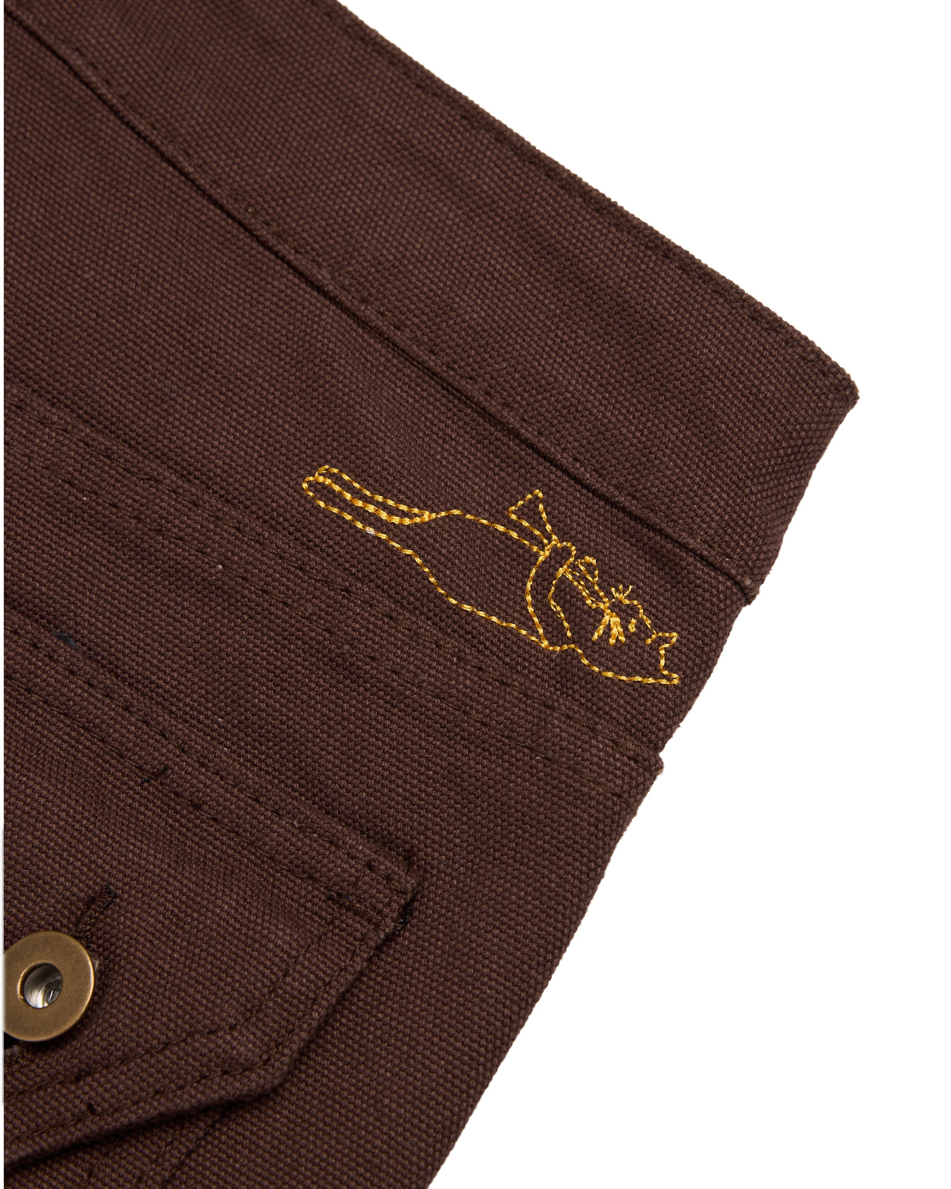 For this version of the pants we used a 12 oz brown duck canvas. Updated brass rivets covering all stress points of the pant. The garment also features full flat fell seams throughout as well as a split waistband. And as always our Jazz cat logo is embroidered on the yoke.