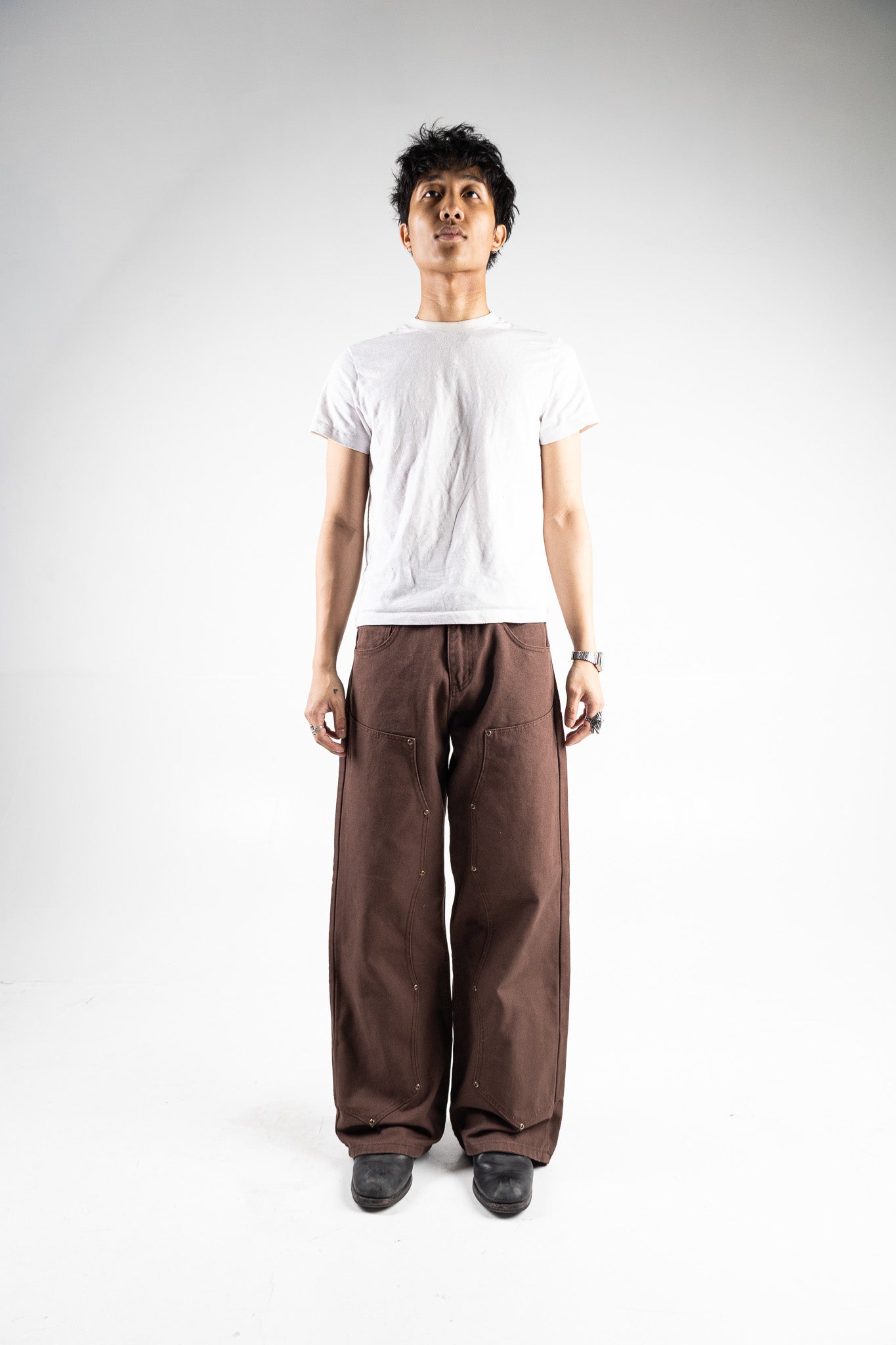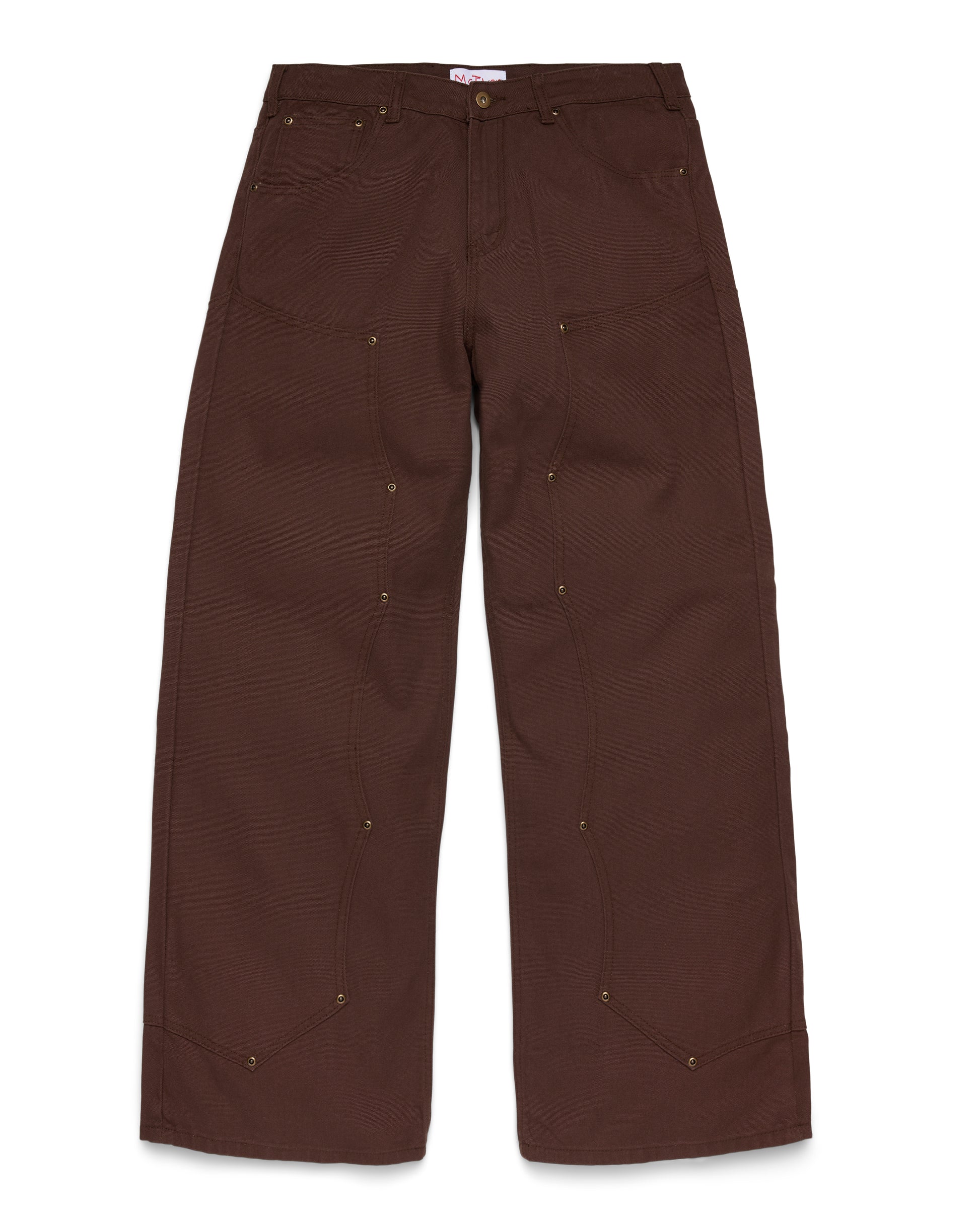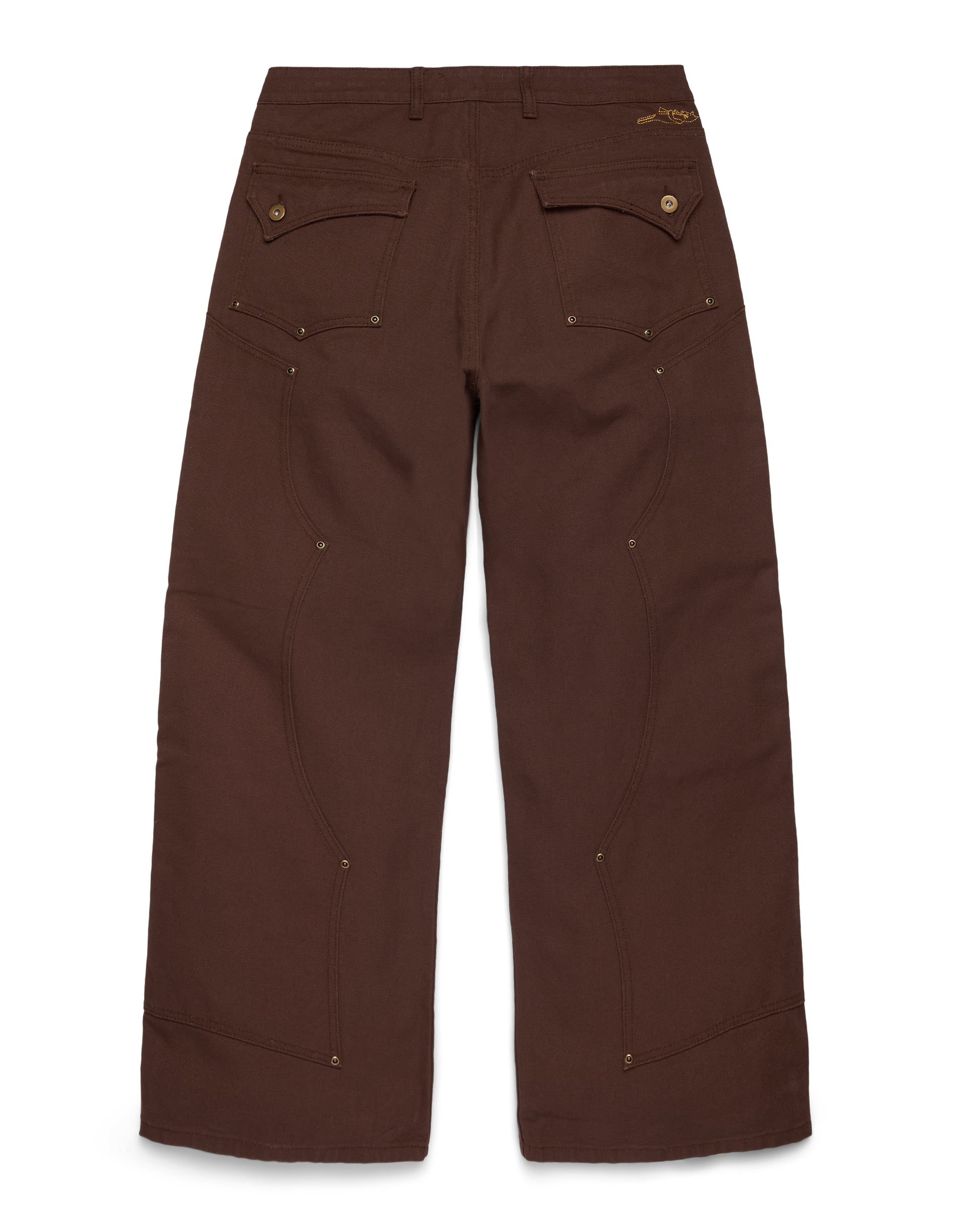 For this version of the pants we used a 12 oz brown duck canvas. Updated brass rivets covering all stress points of the pant. The garment also features full flat fell seams throughout as well as a split waistband. And as always our Jazz cat logo is embroidered on the yoke.